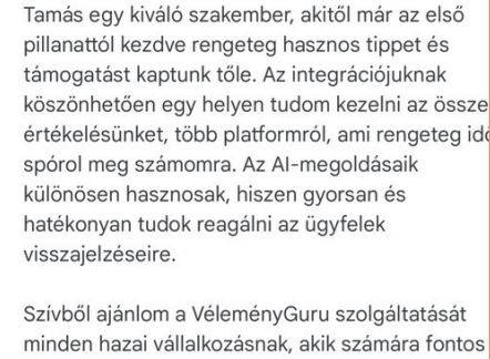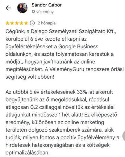 Összefoglalva, a VéleményGuru nemcsak automatizálta a véleménykérést és azok professzionális megválaszolását, hanem jelentősen javította a Delego